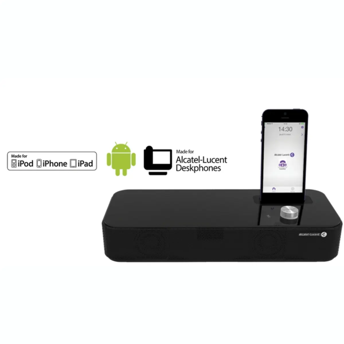 Support audio pour postes téléphoniques Alcatel Lucent de bureau, et également station d'accueil pour périphériques connectés USB ou Jack 3,5 mm, ou par jumelage Bluetooth, l'Alcatel Lucent 8125 Audioffice est un module de conférence versatile disposant d'une qualité sonore très haut de gamme.