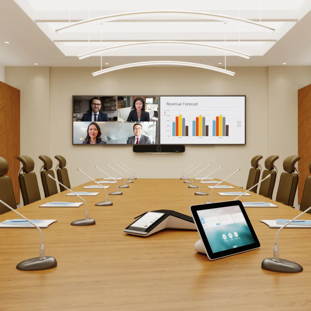 Placement de la caméra, des micros et des haut-parleurs : Ce que vous devez aussi considérer, c’est le placement de la caméra, des microphones et des haut-parleurs pour une sonorisation efficace. La caméra doit idéalement être placée au-dessus de l'écran vidéo, mais ce n'est pas toujours la meilleure option. Si vous utilisez une caméra à 360 degrés, placez-la au centre de votre table de réunion. Les grandes salles de conférence peuvent nécessiter plusieurs caméras, microphones et haut-parleurs.
