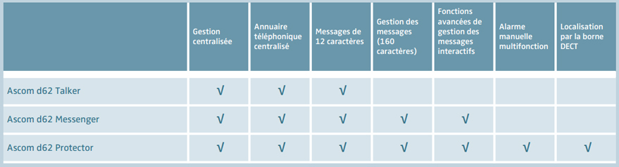 Le téléphone Ascom D62 Messenger Bluetooth s’intègre complètement aux infrastructures DECT et IP DECT Ascom. Il est idéal pour répondre aux besoins variés des secteurs tels que la santé, les administrations ou les structures industrielles légères.