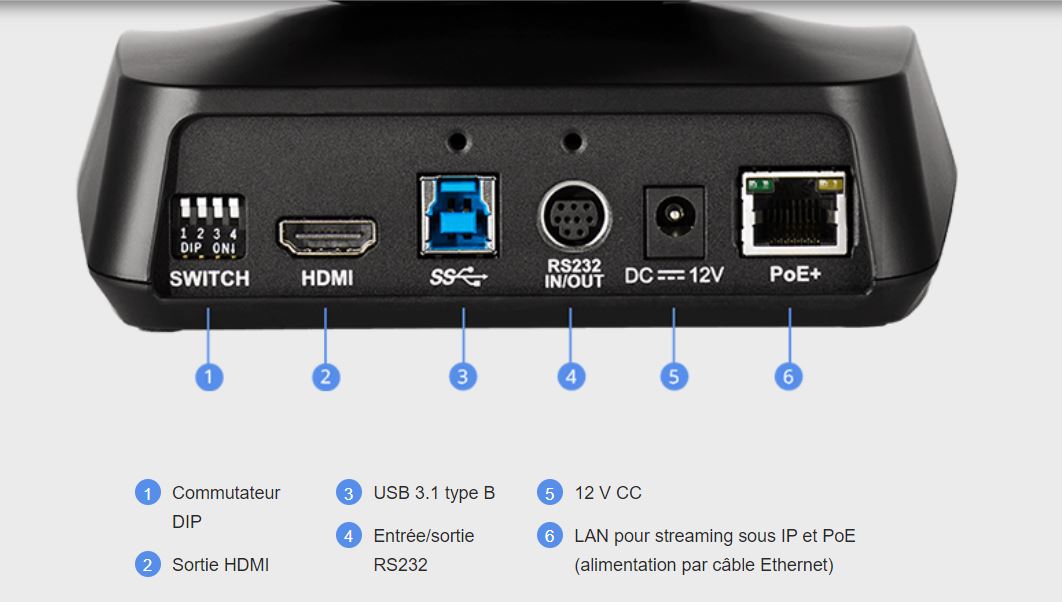 - Connectivité PoE, HDMI 1.3, DIP Switch