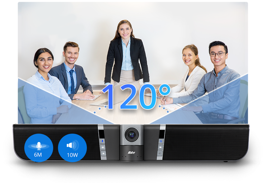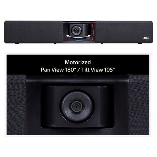 La caméra de la barre vidéo AVer VB342 Pro offre un champ de vision fixe de 92°. Motorisée, elle se déplace panoramiquement à 180° et s'incline à 105° afin de capturer la salle de réunion et l'ensemble des participants présents, tout en évitant les déformations sur le bord de l'image.