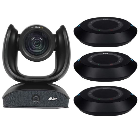 Ce kit complet pour très grande salle de réunion se compose d'une caméra AVer CAM570, d'une enceinte de conférence AVer FONE540 et de 2 enceintes d'extension.