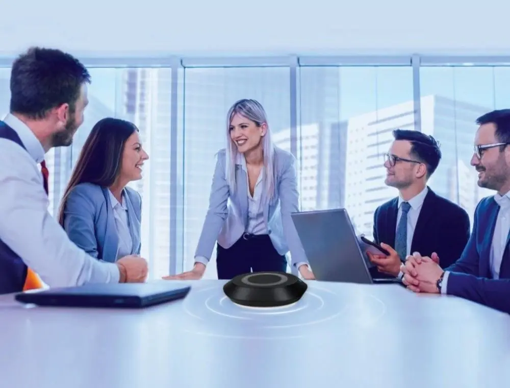Le micro, haut-parleur de conférence, s'alimente sur secteur. Il se connecte au PC en USB-A ou en Bluetooth pour une utilisation sans fil, et se place en centre de table pour capter les voix de l'ensemble des participants. Les speakerphones d'extension s'y relient en RJ45.