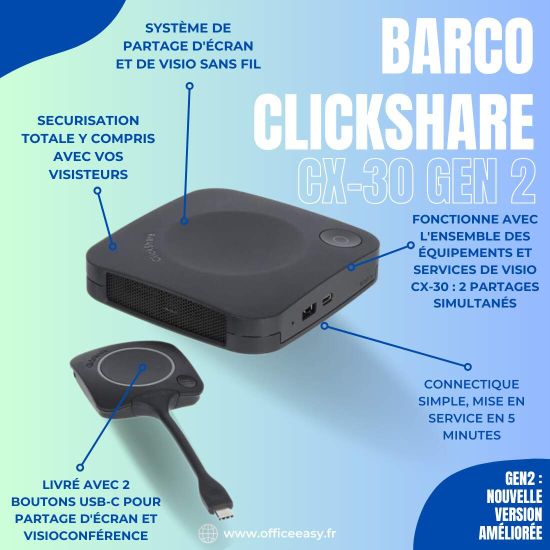 Avec une triple compatibilité, la solution de collaboration Barco Clickshare CX-30 vous permet de vous retransmettre du contenu depuis un ordinateur (PC ou Mac), un smartphone ou une tablette (Android, iOS) sur grand écran sans relier de câble HDMI.