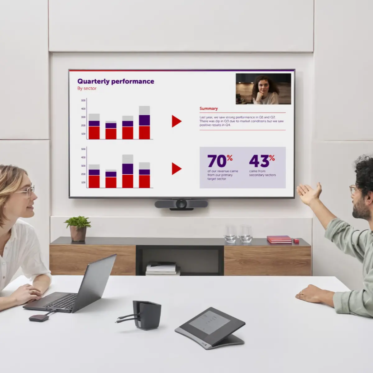 Avec la solution Barco ClickShare CX-30, jusqu'à 32 personnes peuvent être connectées en même temps et 2 personnes peuvent partager du contenu simultanément.