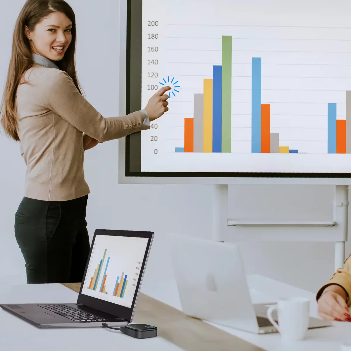 Le VS25 facilite grandement le partage de contenu. Appuyez sur le bouton branché à votre ordinateur, votre écran se duplique en plus grand sur celui de la salle de réunion. Aucun logiciel n'est nécessaire.