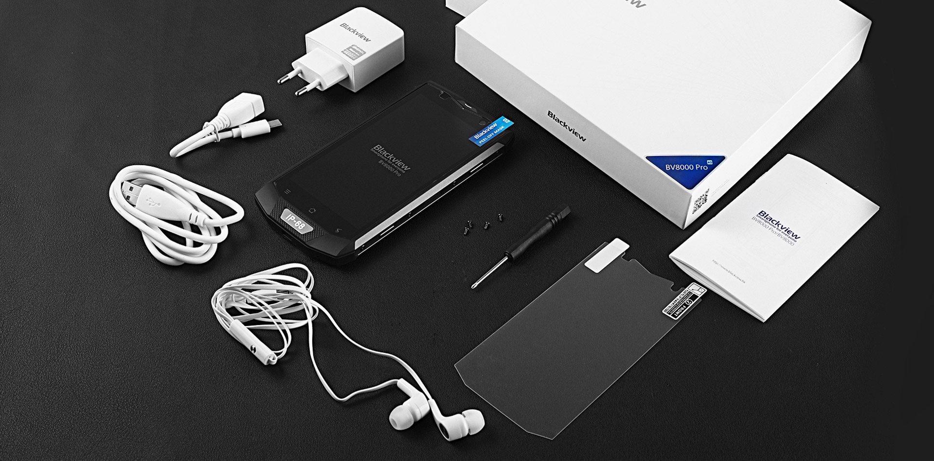 Le BV8000 Pro est livré avec un chargeur, un adaptateur micro-USB, un kit mains-libres (écouteurs) et un mini tournevis avec des vis supplémentaires.