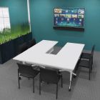 Ici, nous vous proposons 3 tables droites pour former une table de réunion en forme de U (pour 6 personnes). Des voiles de fond, d'une épaisseur de 16 mm, sont intégrés pour cacher les jambes des participants.