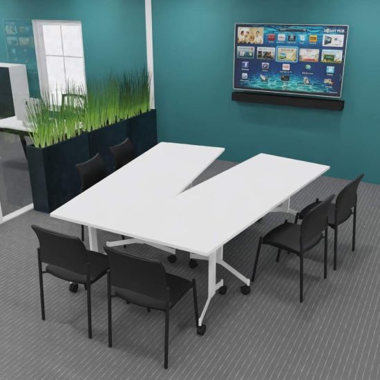 Ici, nous vous proposons 4 tables droites et une 1 table trapèze pour former une grande table de réunion en forme de V. Des voiles de fond, d'une épaisseur de 16 mm, sont intégrés pour cacher les jambes des participants.