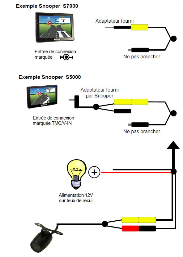 Vous pouvez paramétrer l'activation automatique de la caméra de recul dès que vous enclenchez la marche arrière en reliant l'alimentation 12V à un des feux de recul du véhicule.