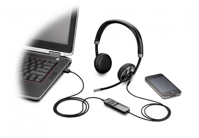Micro casque téléphonique filaire binaural avec annulation active du bruit, connexion USB.