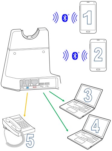 Certains produits high-end sont mêmes équipés de plusieurs de ces connectiques pour y brancher jusqu’à 5 devices ! Par exemple, le Jabra Engage 75 Duo dispose de 5 connexions simultanées :