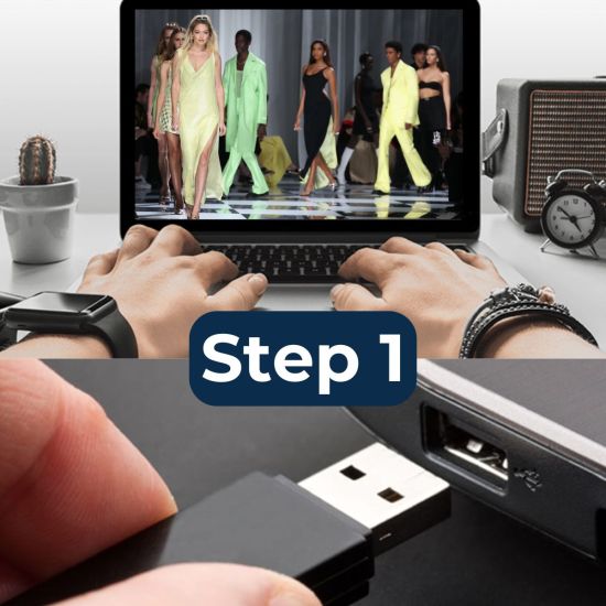 - Ajoutez des contenus multimédias sur votre Clé USB (64 Go max) depuis votre PC Windows ou Mac. Les contenus peuvent être de natures diverses : photos, vidéos, PDF, diaporamas, ... ;
