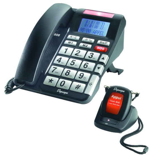Téléphone filaire Depaepe HD Max SOS : téléphone grosses touches, médaillon sans fil pour appel d'urgence à distance inclus.