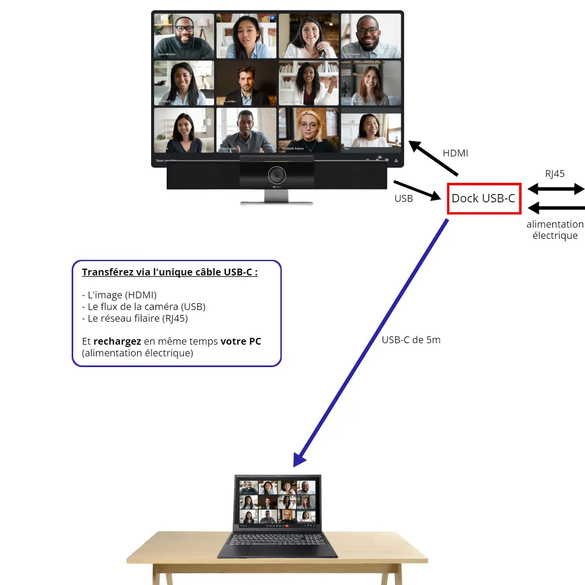 Le dock USB-C facilitera vos réunions collaboratives à distance. Grâce à lui, vous n'aurez plus qu'à connecter un seul câble USB-C sur votre PC pour récupérer l'ensemble des périphériques connectés (écran et caméra notamment). Ainsi, lorsque vos collaborateurs arriveront en salle de réunion pour participer à une visioconférence depuis la plateforme collaborative de leur choix (Microsoft Teams, Google Meet, Zoom, ou autres), ils n'auront qu'à brancher cet unique câble à leur ordinateur pour récupérer le flux de la caméra et transférer l'image sur l'écran de partage.
