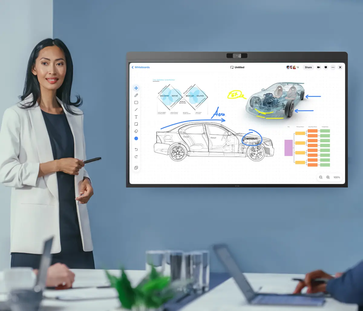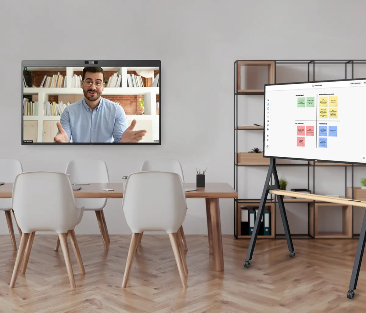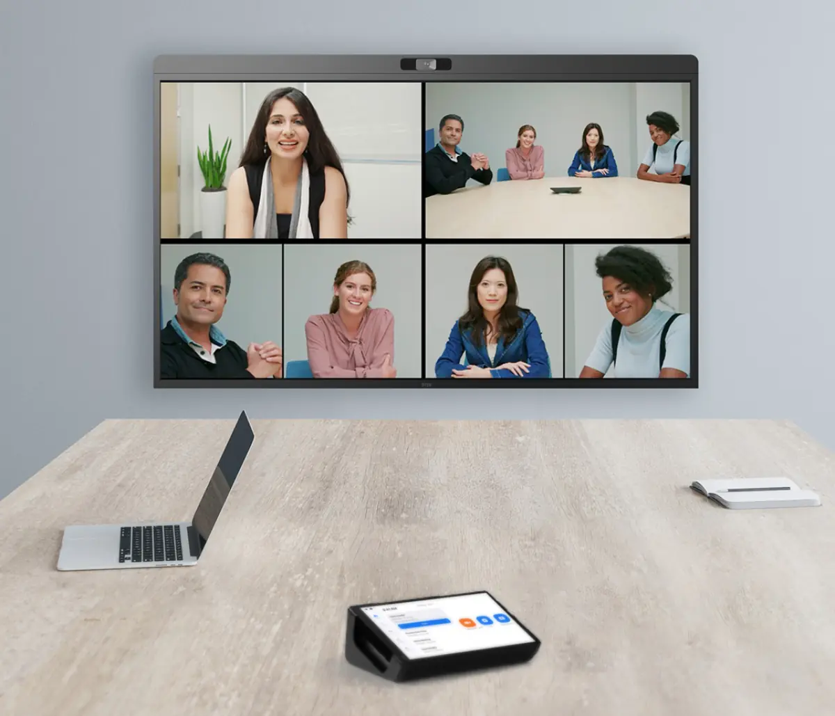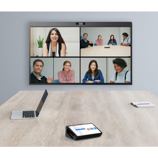 Les solutions de salle Zoom Rooms ou Microsoft Teams Rooms vous permettent de lancer vos réunions en un clic directement depuis l'écran, sans avoir à connecter votre ordinateur personnel en USB à l'équipement audio et vidéo de la salle. Pour ce faire, il vous faudra une licence de salle.