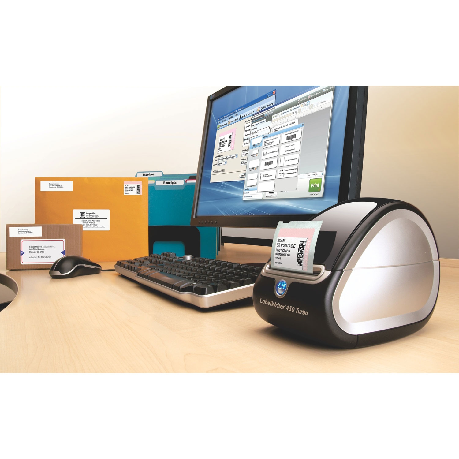 Imprimante de bureau légère (654 g), se connectant en USB sur ordinateur (PC ou Mac, compatible Windows XP, Vista, 7, ou Mac OS), la Label Writer 450 de Dymo permet d'imprimer en Thermique direct (pas de cartouche ni de toner) des étiquettes à une vitesse de 51 unités par minute, à une résolution de 600 x 300 dpi.