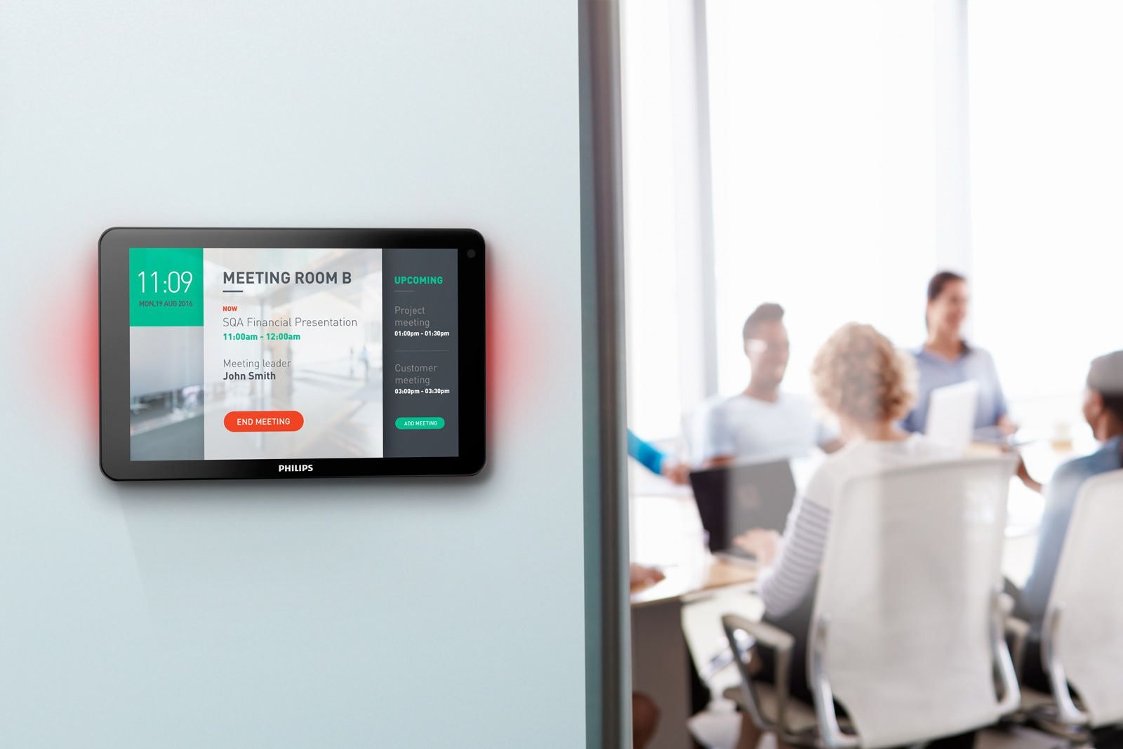 Ce système de réservation Philips est équipé de barres de LED vous indiquant l'état de la salle de réunion d'un simple coup d'oeil. Fonctionnant sous Android, il vous permet d'enregistrer votre propre application directement dans l'écran ou d'en sélectionner une dans le vaste catalogue proposé.