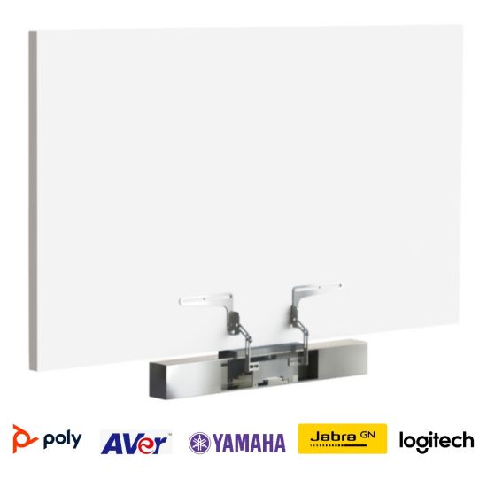 C'est une solution idéal pour une fixation d'un écran de réunion au mur : pas besoin de tablette pour poser la caméra, pas besoin de trépied pour la barre de visio.