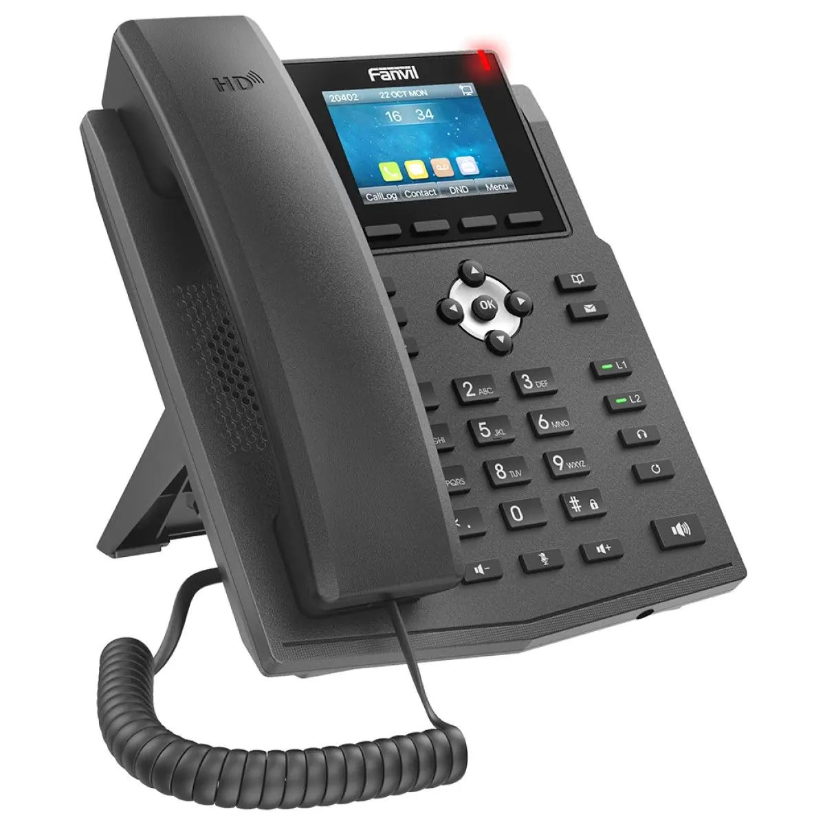 Le téléphone Fanvil X3SG est un téléphone IP SIP d'entrée de gamme pouvant prendre en charge jusqu'à 4 comptes. Son écran couleur 2.8 pouces ainsi que ses 4 touches de ligne programmables font néanmoins de lui un atout de taille dans votre bureau. Facile à mettre en place, il s'alimente via PoE grâce à ses 2 ports Ethernet, compatible Gigabit. Vous pourrez d'ailleurs grâce à ses 2 ports, récupérer également la connexion sur votre laptop en le connectant directement sur le X3SG Pro Fanvil.