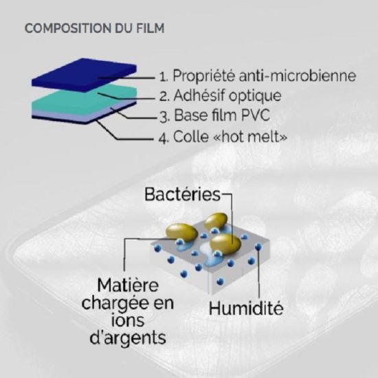 Le film de protection anti-bactérien est un filtre multicouche transparent de 135 microns (soit l'équivalent de l'épaisseur d'une feuille A4), contenant des agents anti-microbiens. Sans nano particule, sans produit chimique et non irritant, le film est enduit d'un adhésif en silicone, sensible à la pression. Idéal pour les lieux nécessistant un degré d'hygiène important, le film produit une réduction bactérienne de 99.99% vérifiée. L'activité anti-virale sur souche Coronavirus humain (HCoV-229E) agit à 94.99% après 15 minutes et 99.87% après 60 minutes de contact.