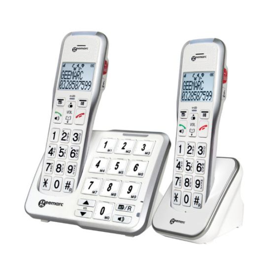 Le Geemarc AmpliDect 595 Photo duo se compose de deux téléphones sans fils DECT et d'une base.