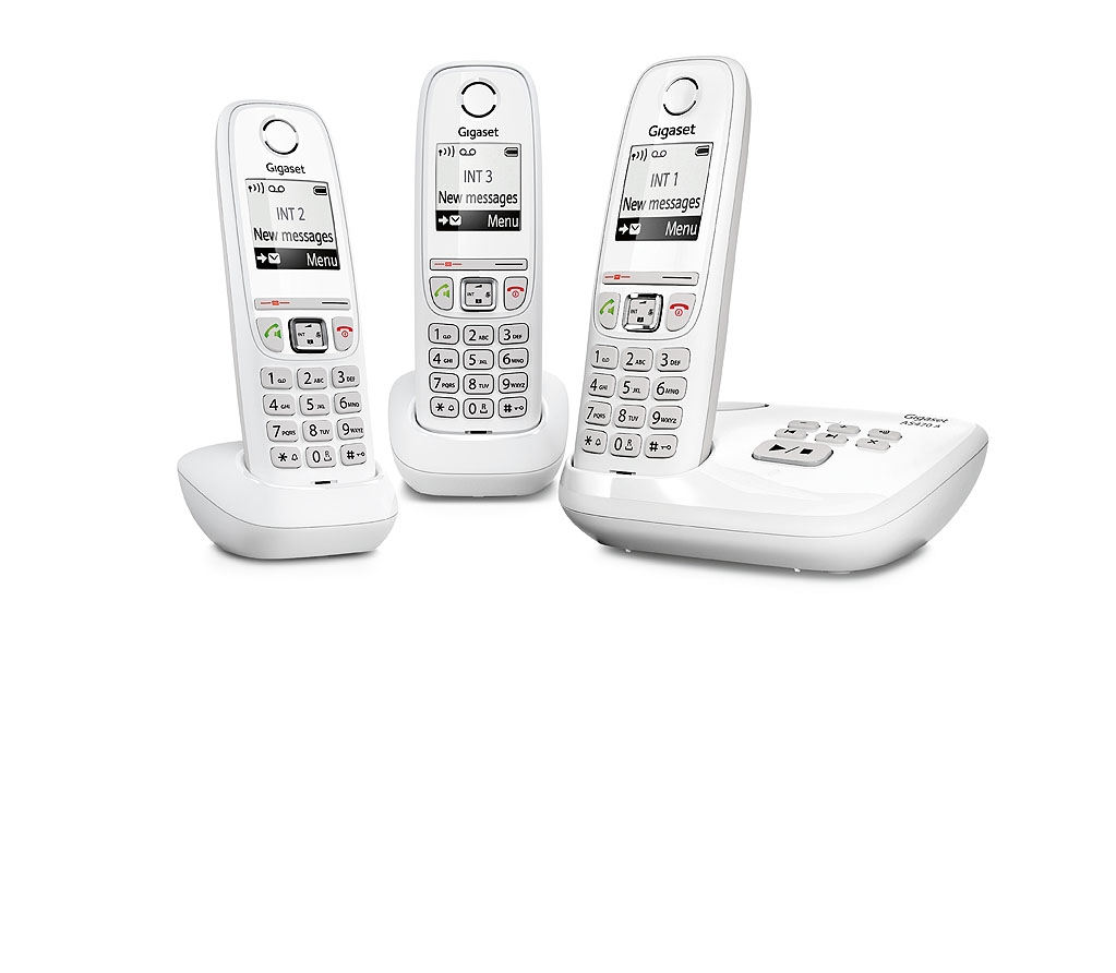 Le pack trio de Gigaset composé de 3 téléphones sans fil blanc Gigaset AS470 et d'un répondeur intégré AS470A.