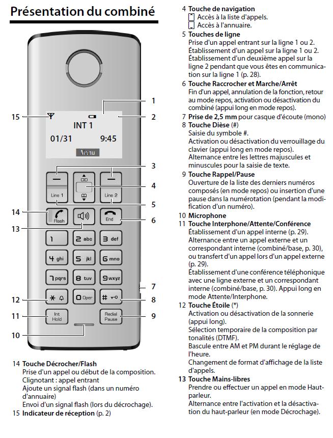 - 2 répondeurs intégrés : 1 pour chaque ligne. Jusqu'à 30 minutes d'enregistrement (partagées sur les 2 répondeurs)