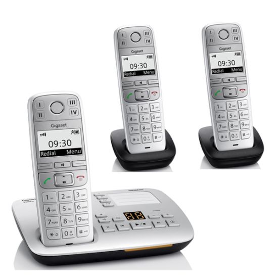 Téléphone sans-fil Gigaset E500A Trio : 3 combinés, utilisation simple, grande lisibilité, acoustique claire et puissante, répondeur intégré 25 minutes.
