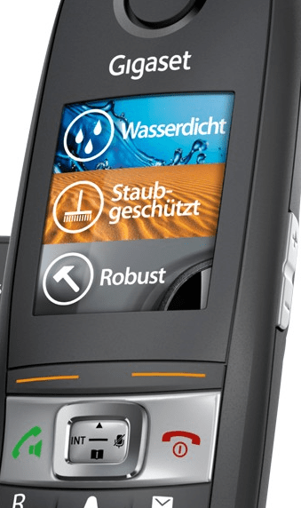 Le Gigaset E630 est un téléphone sans fil ultra résistant conforme à la norme IP65 : résistant aux chocs, aux jets d'eau et aux poussières.