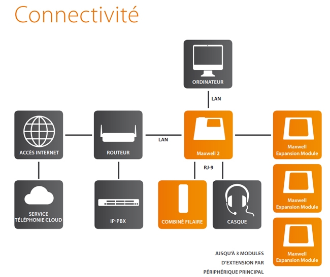 POE, le Gigaset Maxwelle 2 dispose de 2 ports Gigabit Ethernet, ainsi qu'une prise casque RJ9 afin de passer les appels en mains libres via un casque filaire. Un haut parleur Full Duplex intégral peut également être utilisé afin de communiquer en toute liberté les mains libres.