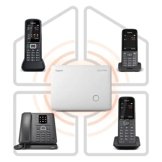 Avec sa mise en marche simplifiée, la base DECT Gigaset N210Pro offre la possibilité d'un usage rapide et efficace, notamment dans les petites entreprises. Connectez jusqu'à 6 combinés supplémentaires Gigaset (Maxwell C, S700H ou encore R700H), et profitez d'une flexibilité sans égale.