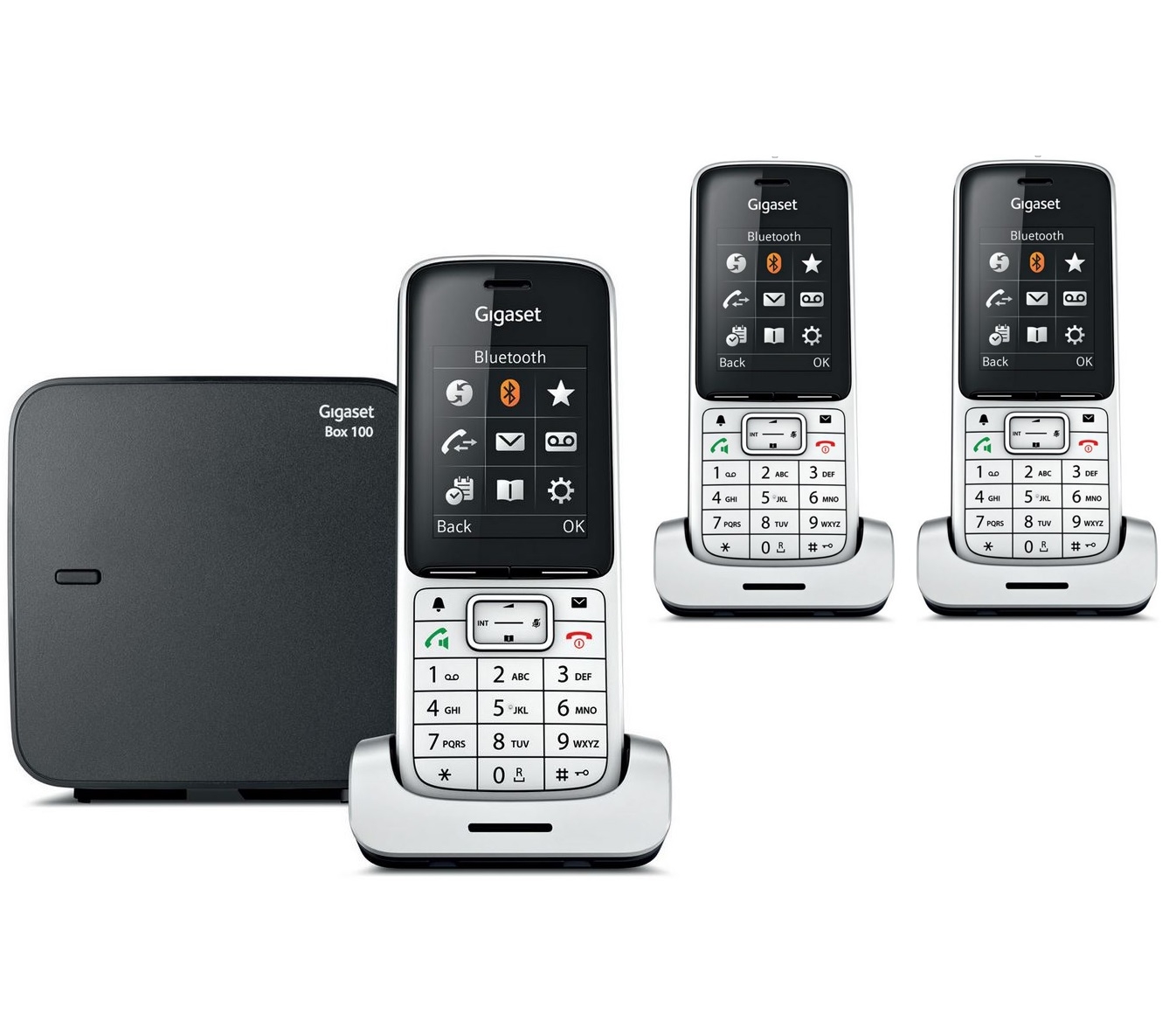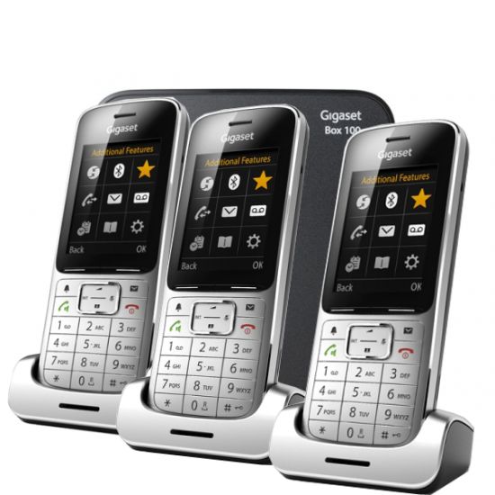 La solution DECT Gigaset SL450 trio se compose d'une base déportée et de trois combinés sans fil SL450H. Le mode ECO-DECT permet de réaliser des économies significatives d'énergie : la puissance transmise s'adapte à la distance séparant la base des combinés. Il est possible de paramétrer un mode Eco réduisant de fait la portée et la puissance transmise par la base.