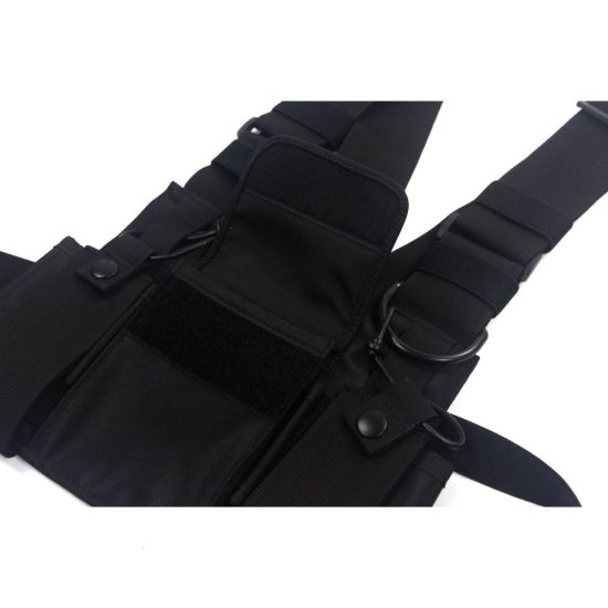 Ses deux poches radios ne comportent pas de rabat sur le dessus ce qui est un réel atout pour l'antenne. Pour autant, vous ne ferez aucun compromis sur la sécurité de votre radio, celle-ci étant maintenu par un cordon de serrage Bungee. Le serrage est totalement réglable et donne accès aux talkie walkie très rapidement pour les changements de canaux ou réglagles de volume.