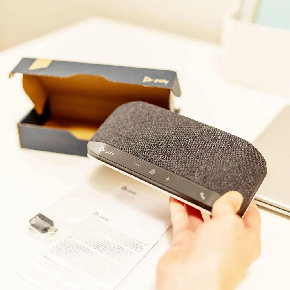 Le Poly Sync a été conçu pour un travailleur actif qui jongle entre le télétravail et différentes petites salles de réunion ou espaces de travail. Simple d’installation grâce au Plug & Play mais également nomade avec ses 20 heures d’autonomie en Bluetooth, vous pourrez travailler où que vous soyez. Écoutez également votre playlist de musique favorite pendant vos pauses. Poly a pensé à une protection contre l’eau et la poussière pour ses Poly Sync. En effet, la certification IP64 vous permet de profiter pleinement de votre enceinte de conférence sans avoir peur si votre tasse de café tombe sur ce dernier.
