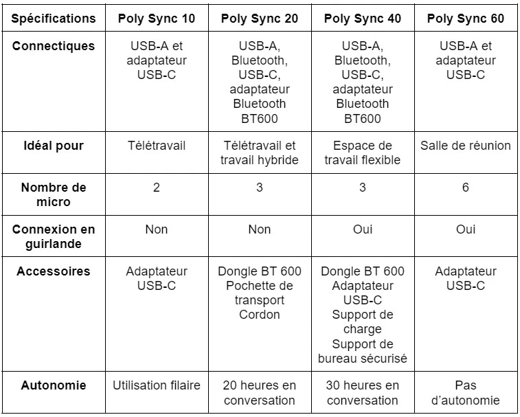 Voici un tableau comparatifs récapitulatifs Poly des différents speakerphones en fonction de l’utilisation souhaitée :