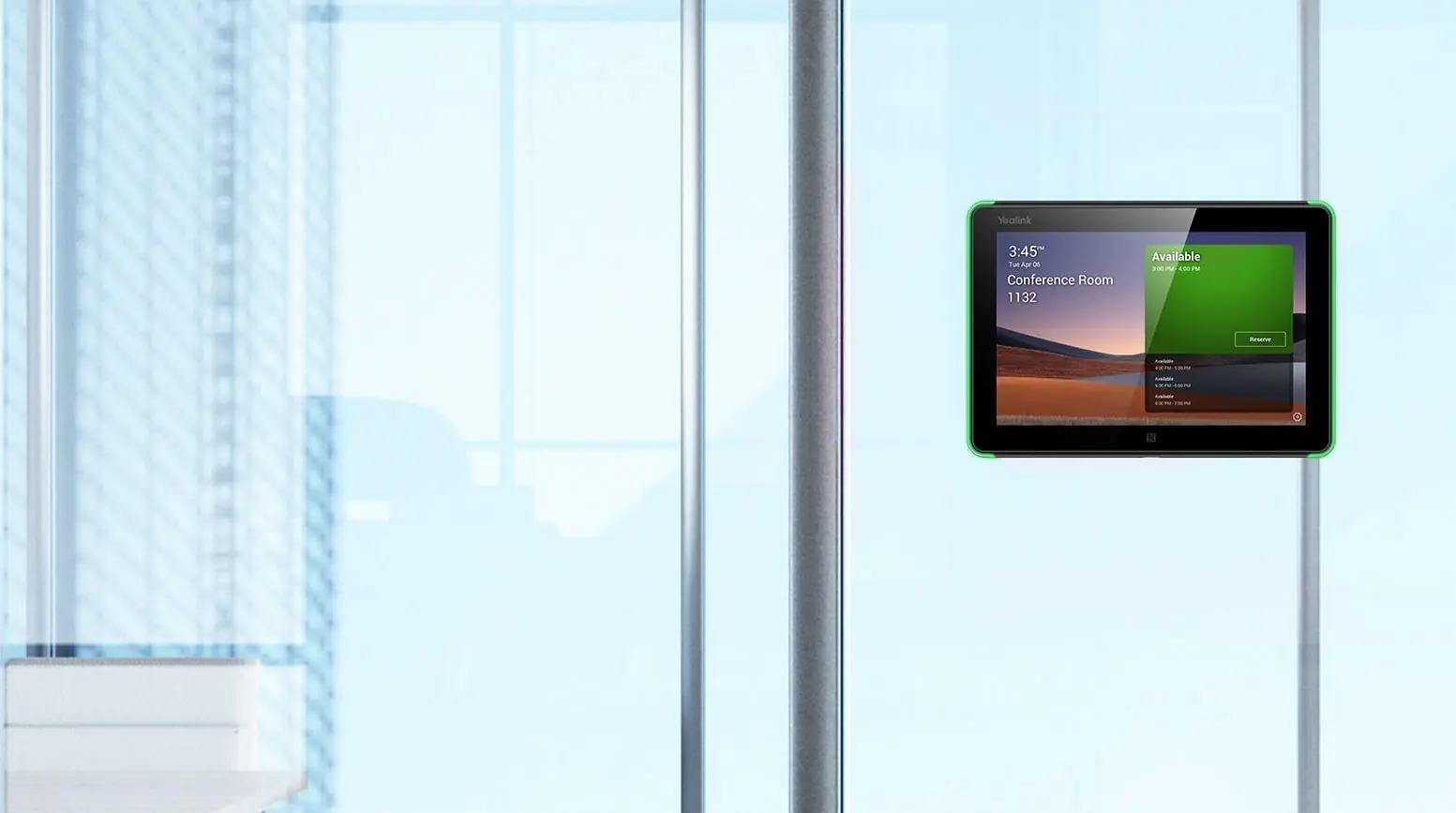 - Un écran de réservation de salle : les écrans de réservation de salle facilitent la gestion des espaces partagés. Ces derniers s'installent à l'extérieur de la salle et se connectent à l'agenda de votre entreprise. En un coup d'oeil, les collaborateurs sont informés de la disponibilité de la salle.