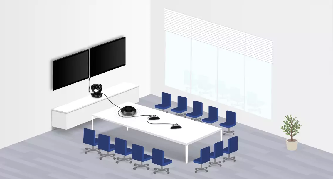 Selon la taille de votre salle et la qualité souhaitée, il convient d’y ajouter différents périphériques : écran mais aussi barre de son, enceintes, micros centre de table ou micros plafond, visualiseur ou bien encore d’autres caméras déportées.