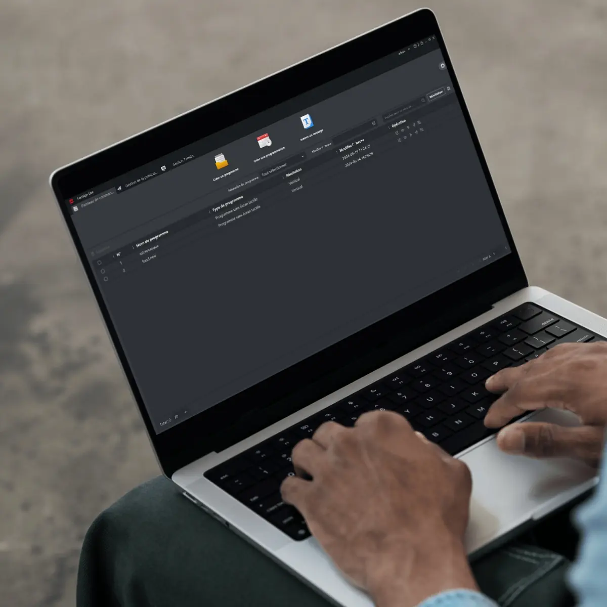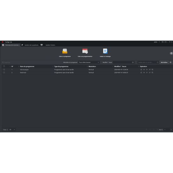 Le logiciel est à télécharger sur PC Windows, vous pouvez le faire sur votre appareil professionnel, mais il est conseillé d'utiliser un vieux PC dédié. L'interface est facile d'utilisation et se compose de 3 fenêtres : la création du contenu, la programmation du contenu et la gestion du terminal.