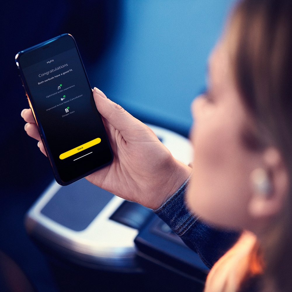 Vous pouvez régler des paramètres comme le niveau d'intensité de l'ANC ou de HearThrough grâce à l'application Jabra Sound +. L’application est disponible sur Google Play ou sur l’App Store. Ainsi, vous pouvez vous adapter aux différentes situations grâce à cette régulation.