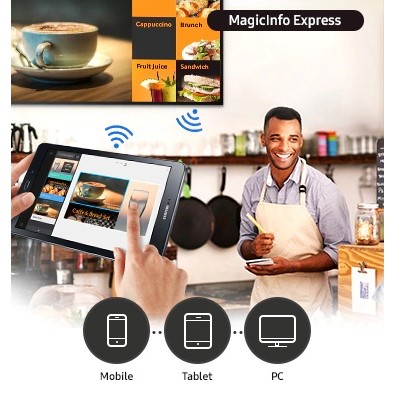 Pour aller plus loin et proposer un contenu interactif à votre clientèle, Samsung propose le logiciel gratuit et en français MagicINFO Express 2. Vous pouvez l’utiliser sur PC (Windows ou Mac), Smartphones ou tablettes (Android ou iPhone/iPad iOS).