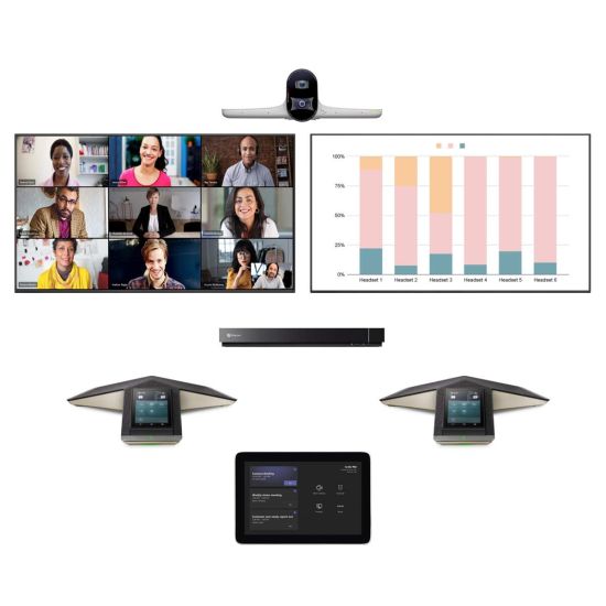 Elaboré par l'équipe OfficeEasy, ce kit visioconférence Microsoft Teams Rooms pour grande salle se compose d'une caméra Poly Studio E70, de 2 téléphones de conférence Poly Trio C60 certifiés Teams, d'une tablette de contrôle Poly TC10, d'un codec Poly G7500, de 2 écrans professionnels Samsung avec taille au choix et de 2 supports muraux inclinables.