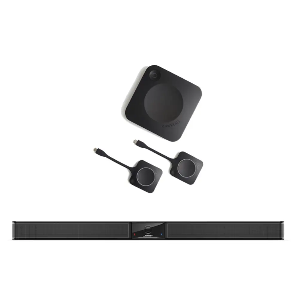Equipez votre salle de réunion en un clin d'oeil grâce à la Vidéobar VB1 de Bose et au système de partage d'écran sans fil ClickShare CX-30 de Barco ! Tout est inclus, il ne vous reste plus qu'à brancher votre équipement à l'écran de votre salle de réunion et à lancer une visioconférence sur la plateforme de votre choix (Zoom, Microsoft Teams, Google Meet, etc.).