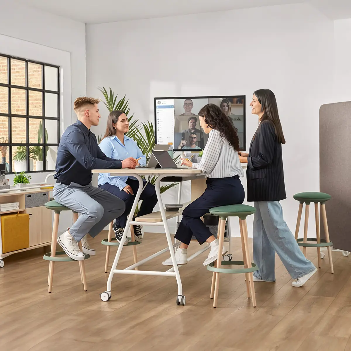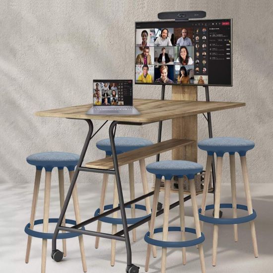 Pour les espaces de travail ouverts, style plateaux, ou les salles de réunion de petite taille, OfficeEasy propose un pack de visioconférence complet. En collaboration avec nos partenaires de confiance, tels que Samsung et Poly, ce kit comporte tout l'équipement nécessaire pour réaliser des réunions d'équipe ou des visioconférences. La forme pyramidale est parfaitement à la visioconférence car elle améliore la visibilité de tous les participants. La table est mobile grâce à ses roulettes : elle s'intègre parfaitement dans des bureaux ouverts où vous pouvez la déplacer librement