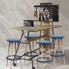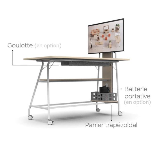 - D'une table trapézoïdale mobile de 4 ou 5 personnes avec support pour écran intégré, goulotte verticale arrière en PET, panier trapézoïdal et kit d'électrification