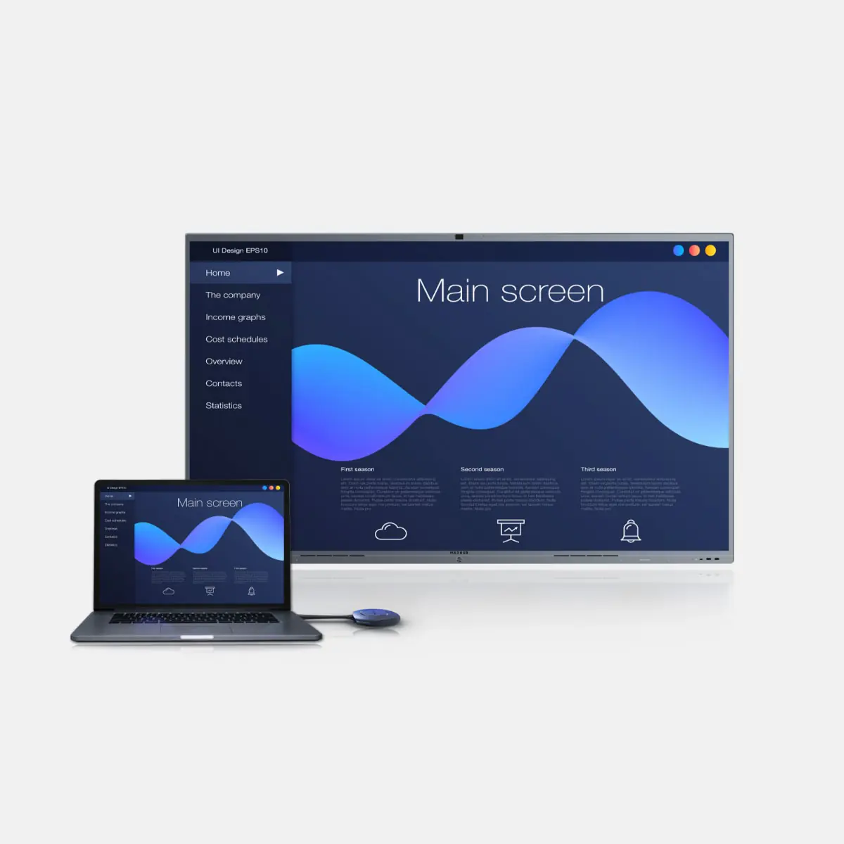 Partage via le dongle : Le dongle se branche en USB à votre ordinateur. Il est compatible avec Chromebook, Mac, PC Windows ou Linux. En appuyant sur le bouton, vous dupliquez votre écran en moins de 5 secondes. Le dongle permet également la connexion à la caméra branchée sur l'écran.