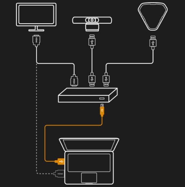 Vous n'avez plus qu'un seul câble à relier à votre ordinateur pour vous connecter à la totalité des équipements de votre salle, grâce au Konftel OCC Hub sur lequel vous pouvez brancher en USB la caméra et l'enceinte de conférence, mais aussi votre écran en HDMI.