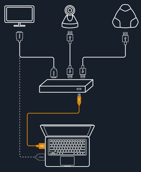 - Connectiques : 1x USB 3.0 (PC), 2x USB 2.0 (caméra et téléphone de conférence), 1x HDMI (écran)