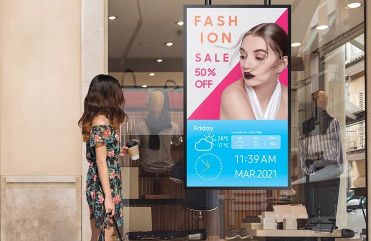Si votre magasin est située en pleine rue et très souvent éclairé par le soleil, votre écran vitrine doit compenser cette lumière intense pour garder son utilitée première : Attirer l’oeil et mettre en valeur votre boutique