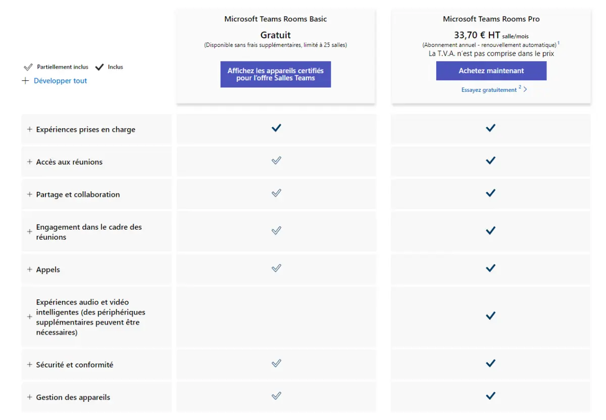 Les licences Pro sont facturées à l'unité, par salle et par mois (33,70 €). La licence Basic, quant à elle, est offerte aux clients ayant investi dans une solution de salle certifiée Microsoft Teams Rooms (dans la limite de 25 salles).